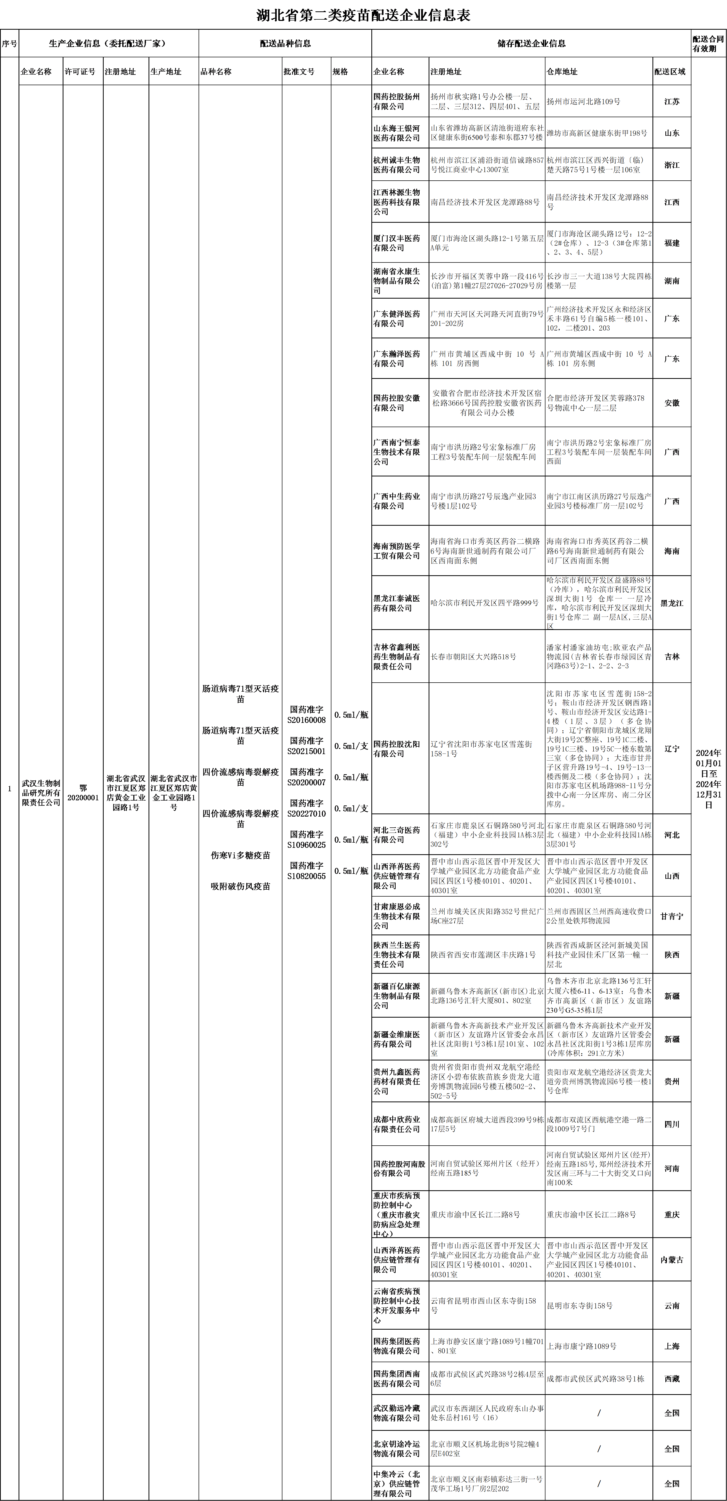 湖北省第二類疫苗配送企業(yè)信息表(武漢生物制品研究所有限責(zé)任公司)