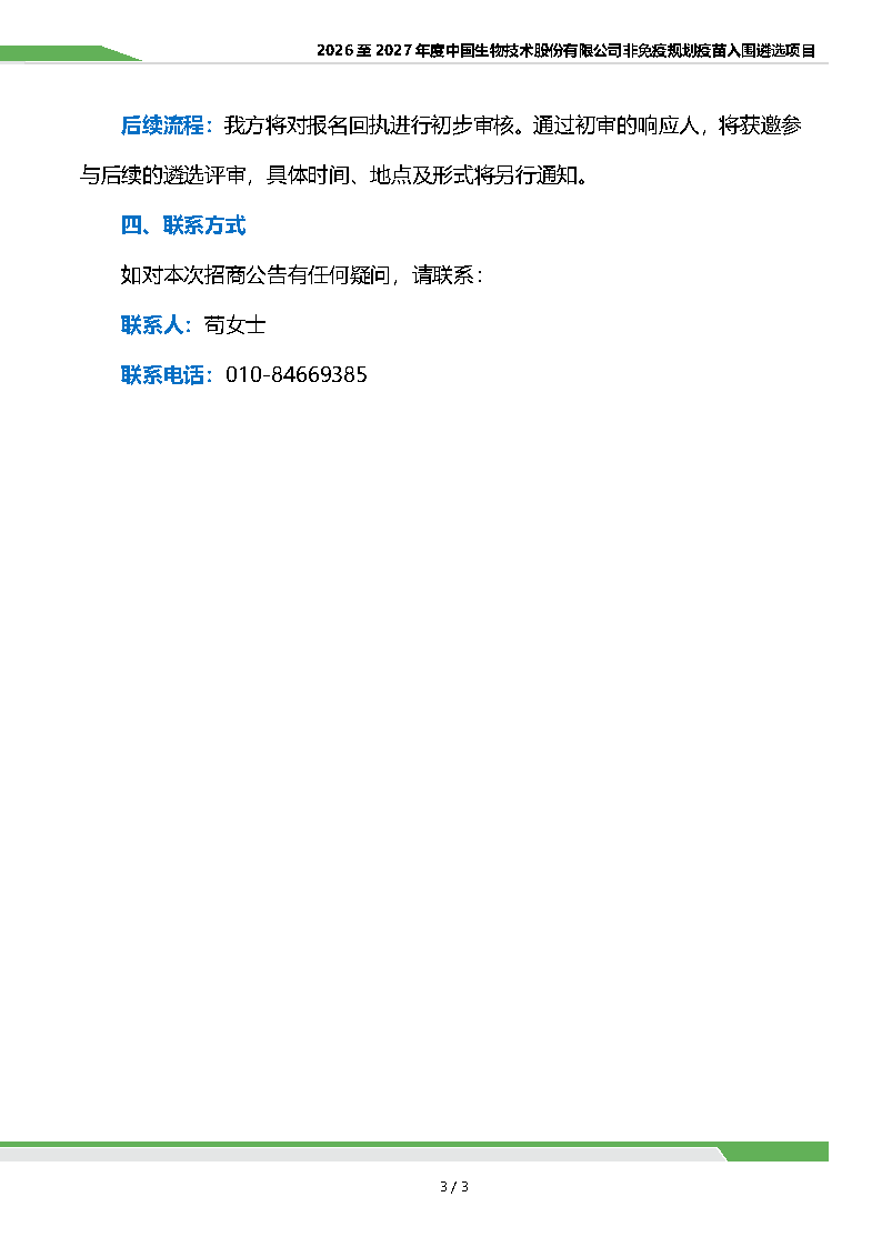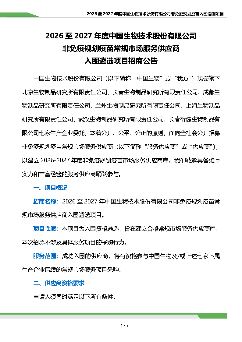 2026 至 2027 年度中國生物技術(shù)股份有限公司非免疫規(guī)劃疫苗常規(guī)市場服務(wù)供應(yīng)商入圍遴選項(xiàng)目招商公告